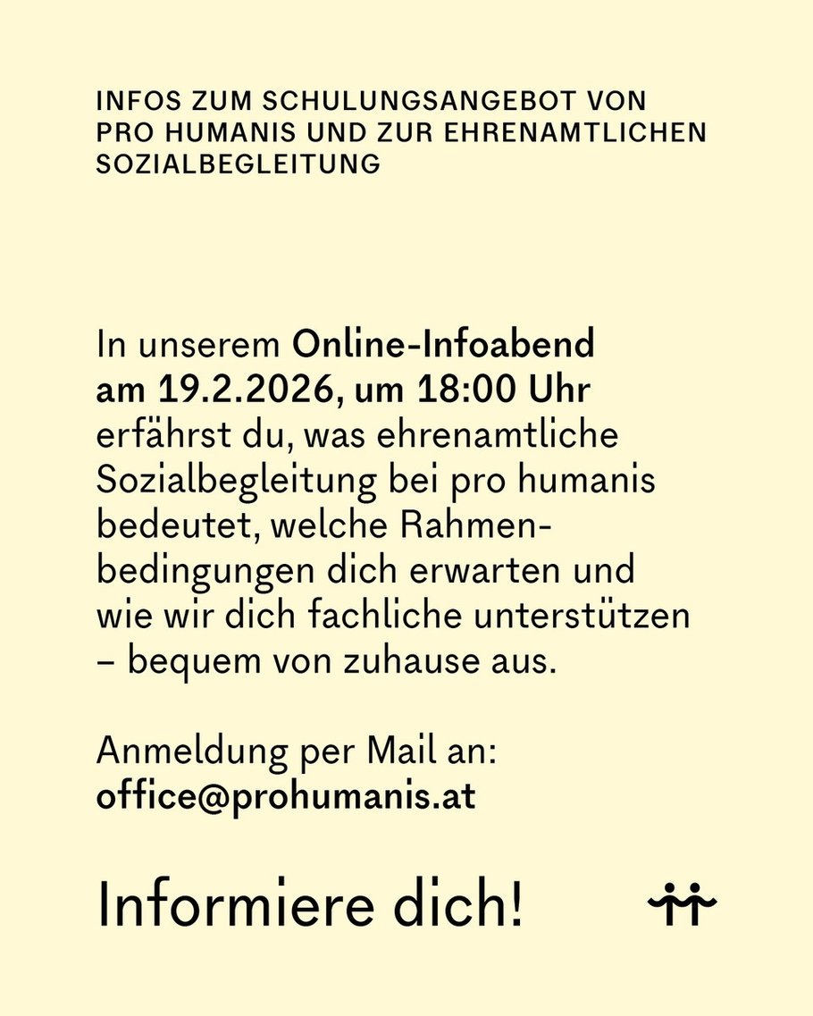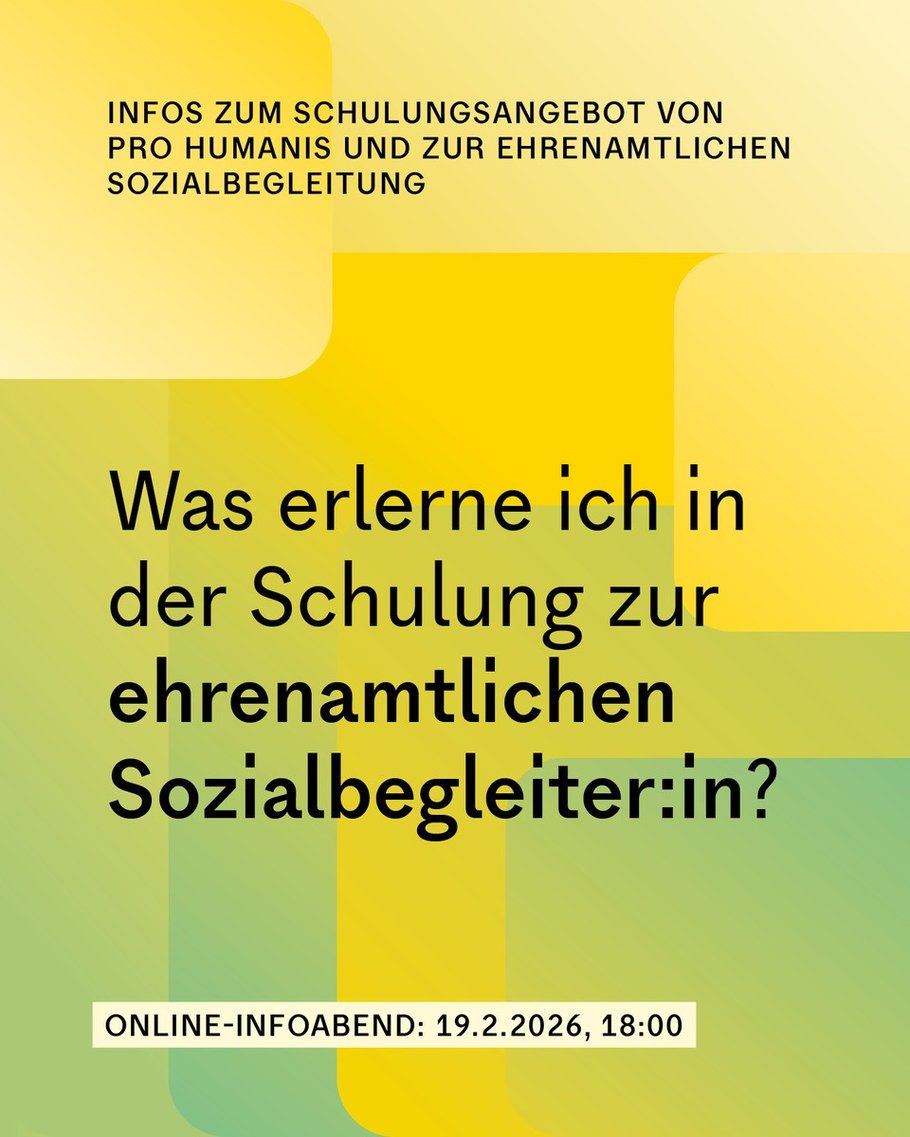 Sozialbegleitung bietet eine tragfähige und verlässliche Beziehung, die eine spürbare Verbesserung der seelischen Gesundheit bewirken kann. Angehende ehrenamtliche Sozialbegleiter:innen erhalten für das Gelingen dieser niederschwelligen Unterstützung bei pro humanis eine kostenlose Ausbildung über psychische Erkrankungen und den Umgang mit Betroffenen sowie regelmäßige kostenlose Supervisionen und Weiterbildungen.